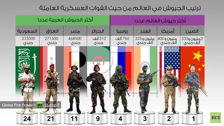 إنفوجرافيك: ترتيب الجيوش في العالم من حيث القوات العسكرية العاملة | |||