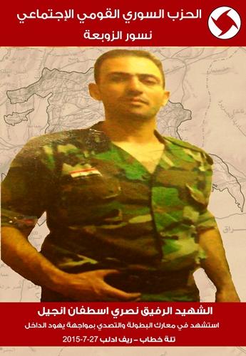 يزفّ الحزب إلى الأمة وعموم السوريين القوميين الاجتماعيين في الوطن وعبر الحدود الرفيق نصري اسطفان إنجيل شهيداً أثناء تأديته واجبه القومي في مواجهة القوى الإرهابية المتطرفة.