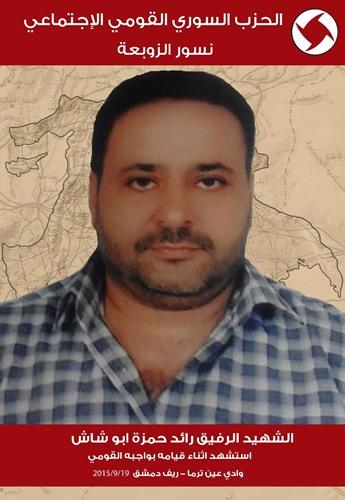 يزفُّ الحزب إلى الأمة وعموم السوريين القوميين الاجتماعيين في الوطن وعبر الحدود خبر استشهاد الرفيق رائد حمزة أبو شاش، في منطقة وادي عين ترما ـ ريف دمشق، اثناء تأديته واجبه القومي.