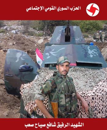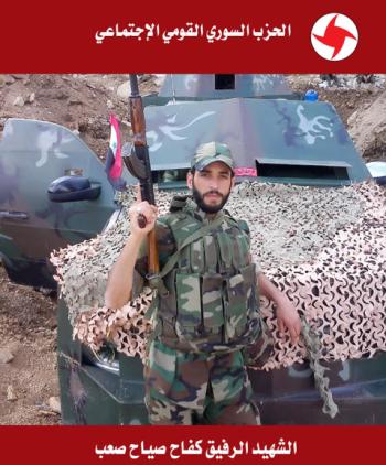 يشيع في بلدة مجادل ــ السويداء الأربعاء 11/11/ 2015 الساعة 12 ظهراً، الشقيقين الرفيقين شافع صياح صعب وكفاح صياح صعب، الذين استشهدا في مواجهة قوى الارهاب والتطرف في معركة تل غمام بريف اللاذقية بتاريخ 1/11/2015. يذكر أن الرفيق شافع انتمى الى الحزب عام 2013، والرفيق كفاح في العام 2014، وتميزا بالاقدام والاندفاع والشجاعة، وهما يتبعان لمديرية شهبا التابعة لمنفذية السويداء في الحزب السوري القومي الاجتماعي.