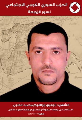 ـــ الشهيد الرفيق ابراهيم محمد الطبل من مواليد مخيم الوافدين 6/1/1979، انتمى الى الحزب في 30/10/2009، شارك في العديد من المعارك ضمن تشكيلات نسور الزوبعة، وكان مقداماً وشجاعاً، مثالاً للقومي الاجتماعي المضحّي في سبيل حزبه وشعبه وأمته.