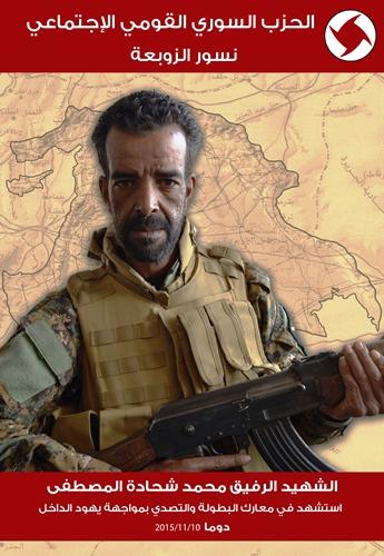 ــــ الشهيد الرفيق محمد شحادة المصطفى من مواليد دوما 30/7/ 1974، إنتمى الى الحزب عام 2011 وانخرط في تشكيلات نسور الزوبعة في العام 2012، ليخوض العديد من المعارك والمواجهات ضد قوى الإرهاب والتطرف، وكان مقداماً وشجاعاً، مثالاً للقومي الاجتماعي المضحّي في سبيل حزبه وشعبه وأمته.