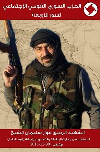 يزفّ الحزب الى الأمة وعموم السوريين القوميين الاجتماعيين في الوطن وعبر الحدود خبر استشهاد الرفيق فواز سليمان الشيخ أثناء تأديته الواجب القومي، في بلدة مهين بريف حمص. والشهيد من مواليد صدد 11/12/1970 انتمى الى الحزب 18/1/2014 وكان مثالاً للقومي الاجتماعي المناقبي. وتحمل مسؤولية مدرب مديرية صدد في الحزب. شارك في العديد من المعارك والمواقع القتالية ضمن تشكيلات نسور الزوبعة، وتميّز بشجاعته وإقدامه. متزوج من ماري عساف ولهما ثلاثة ابناء: وسيم ومريم وسالي. إنّ استشهاد الرفيق فواز الشيخ في بلدة مهين يحصّن التحرير ويجعله ناجزاً ويمهّد الطريق لتحرير كلّ التراب السوري من آفة الإرهاب وداعميه. وإذ يحيّي الحزب السوري القومي الاجتماعي الشهيد الرفيق فواز الشيخ الذي انضمّ الى كوكبة شهداء الحزب السوري القومي الاجتماعي والجيش السوري والحلفاء الذين بذلوا الدماء الزكية دفاعاً عن ارضنا وبلادنا وشعبنا، يعاهده وكل الشهداء على مواصلة طريق النضال والمقاومة حتى تحقيق الانتصار كاملاً على الإرهاب وداعميه، وتثبيت دعائم وحدة بلادنا ومجتمعنا في مواجهة كلّ مشاريع التقسيم والتفتيت والتجزئة، واستعادة أرضنا المغتصبة من الاحتلالين الصهيوني والتركي. التحية للشهيد ولكلّ الشهداء، بدماء الشهداء تستعيد الأمة مجدها وتحفظ عزها وكرامتها. هذا ويشيّع الشهيد في مأتم حزبي وشعبي في بلدة صدد ـ حمص الخميس 31/12/2015 الساعه الواحده ظهراً. البقاء للأمة