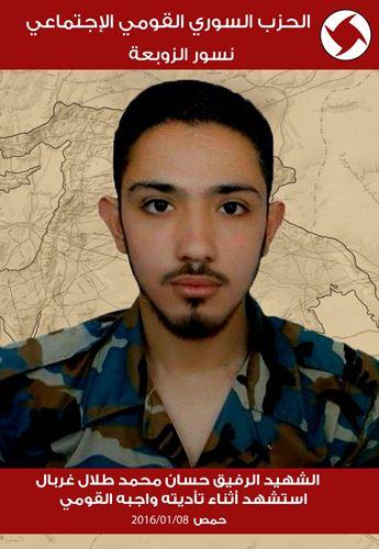 يزف الحزب إلى الأمة وعموم السوريين القوميين الاجتماعيين في الوطن وعبر الحدود، خبر استشهاد الرفيق حسان محمد طلال غربال أثناء تأديته واجبه القومي. الرفيق من مواليد حمص القديمة 1998، عازب، وهو طالب جامعي يدرس التجارة. انخرط ضمن تشكيلات نسور الزوبعة لمقاتلة المجموعات الارهابية المتطرفة، وقد شارك في العديد من المعارك والمواقع القتالية. تميّز باقدامه وشجاعته ومناقبيته. يحيي الحزب شهيده الرفيق حسان غربال، وكل الرفقاء الشهداء الذين بذلوا الدماء الزكية دفاعاً عن أرضنا وشعبنا.. ويؤكد الحزب، أن دماء شهدائه وشهداء الجيش السوري وكل المنخرطين في القتال ضد الارهاب، هي التي تصون الأمة وتصنع نصرها. وليس لنا من خيار، إلا خيار التضحية والنضال ومقاومة الارهاب وداعميه. هذا، ويشيع الشهيد في مأتم حزبي وشعبي في حمص القديمة ـ حي الخضر ـ جامع عثمان ابن عفان يوم السبت 9 كانون الثاني 2016.