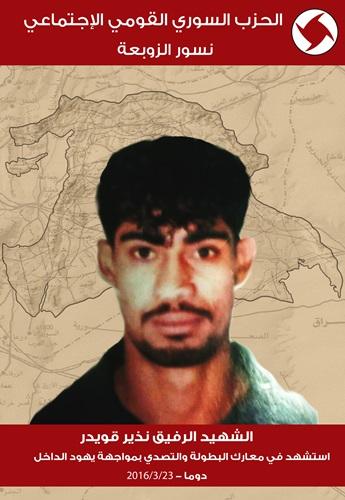 يزفّ الحزب إلى الأمة وعموم السوريين القوميين الاجتماعيين في الوطن وعبر الحدود خبر استشهاد الرفيق نذير راشد قويدر، وذلك أثناء قيامه بواجبه القومي. والشهيد من مواليد البطيحة 1985، انخرط في تشكيلات "نسور الزوبعة" في العام 2013، بعد أن أتمّ عدة دورات عسكرية، وشارك في العديد من المعارك ضد المجموعات الارهابية المتطرفة، وتميز بشجاعته واقدامه ومناقبيته القومية. استشهد بتاريخ 23 آذار 2016، على محور دوما ـ حرستا بريف دمشق. انّ الحزب السوري القومي الاجتماعي، إذ يؤكد اعتزازه بأبطاله المضحين، ولا سيما الشهداء منهم، الذين يبذلون الدماء دفاعاً عن ارضنا وشعبنا، فإنه يعاهد الشهداء على الاستمرار في خوض معركة القضاء على الارهاب والتطرف، وافشال مشاريع الدول التي تدعم الارهاب والارهابيين. إن خيار الحزب السوري القومي الاجتماعي، صلب، ثابت، راسخ، وهو خيار محاربة الاحتلال والارهاب والتطرف، والتصدي بقوة وعزم لكل مشاريع التفتيت والتقسيم، لأن صون وحدة الأرض والشعب، ومحاربة التقسيم والتفتيت هو قرار استراتيجي نابع من صلب العقيدة القومية. ويؤكد الحزب أنّ تضحيات وبطولات القوميين والمقاومين وجنود الجيش السوري وضباطه، تعبر عن ارادة الاحرار الشرفاء الذين يقاتلون الارهاب، ويحققون الانجازات والانتصارات. التحية لكل شهداء حزبنا وشهداء الجيش السوري وشهداء المقاومة، فدماء هؤلاء الشهداء الأبطال، سبيلنا إلى بلوغ النصر الأكيد. وتحية العز والفخر للشهيد الرفيق نذير قويدر، لدمه الزكي الذي روى ارض بلادنا، ولبطولته المؤيدة بصحة العقيدة. البقاء للأمة