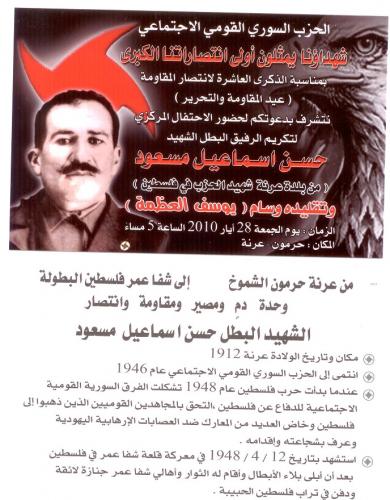 وكان أقيم يوم الجمعة 28 ايار 2010 احتفال مركزي في بلدة "عرنة" لتكريم الرفيق الشهيد حسن اسماعيل مسعود.