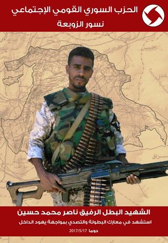 يزّف الحزب الى الأمة وعموم السوريين في الوطن وعبر الحدود، خبر إستشهاد الرفيق ناصر محمد حسين أثناء تأديته واجبه القومي. الرفيق الشهيد من مواليد القنيطرة 1990، متأهل. إنتمى الى الحزب عام 2014 في نطاق مديرية ضاحية المجد التابعة لمنفذية القنيطرة، وكان مثالاً للقومي الإجتماعي الملتزم والمناقبي. إنخرط في تشكيلات "نسور الزوبعة" منذ العام 2013، وشارك في معارك كسب، جسر الشغور، الزبداني، القنيطرة، جرمانا، دوما، الكبّاس، وفي مواقع أخرى كثيرة. إستشهد بتاريخ 17/5/2017 عند محور بساتين دوما، وذلك في اطار عمليات الجيش السوري. إن الحزب السوري القومي الاجتماعي إذ يؤكد وحدة المعركة جنباً إلى جنب مع الجيش السوري، دفاعاً عن وحدة سورية وسيادتها، يعتز باستشهاد الرفيق ناصر حسين ويحيي شجاعته واقدامه، كما يعبر عن اعتزازه وفخره بكل أبطال الحزب وشهدائه وكل شهداء الأمة، ويؤكد على إرادة بذل الدماء الزكية دفاعاً عن أرضنا وشعبنا، بمواجهة الاحتلال والارهاب والتطرف، ولاسقاط مشاريع التقسيم والتفتيت. |