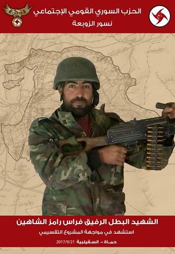 يزف الحزب إلى الأمة وعموم السوريين القوميين الاجتماعيين في الوطن وعبر الحدود، خبر استشهاد الرفيق فراس رامز الشاهين وهو يؤدي واجبه القومي. والشهيد البطل، من مواليد السقيلبية ـ حماه 20/10/1986، متاهل. انخرط في تشكيلات نسور الزوبعة ـ الحزب السوري القومي الاجتماعي، وشارك في العديد من المعارك بمواجهة المجموعات الارهابية المتطرفة، لا سيما في معارك بريديج وقبر فضة والكريم. كان مثالاً في المناقبية والاقدام والشجاعة. استشهد خلال قيامه ورفقائه وبواسل الجيش السوري بالتصدي لهجوم المجموعات الارهابية على مناطق في ريف حماه الشمالي. يحيي الحزب شهادة الرفيق فراس الشاهين، ودمه الزكي الذي به، وبدماء كواكب الشهداء الأبطال ارتوى تراب سوريانا الحبيبة، وعهد الحزب لشهدائه ولكل شعبنا الأبي، مواصلة مسيرة المقاومة حتى تحرير ارضنا من كل احتلال واجتثاث كل ارهاب وتطرف. ويؤكد الحزب، أن ثمار التضحيات التي بذلت دفاعاً عن ارضنا وشعبنا، تتجلى في الانتصارات اليومية التي تتحقق في الميدان، لا سيما في دير الزور وريف حماه، حيث تلقى الارهاب ورعاته الدوليين والاقليميين والعرب هزيمة مدوية، تضعه على طريق الزوال والاندثار. هذا، ويشيع الشهيد البطل عند الساعة الواحدة ظهر اليوم الخميس 21/ايلول/2017 في كنيسة بطرس وبولس بمدينة السقيلبية. |