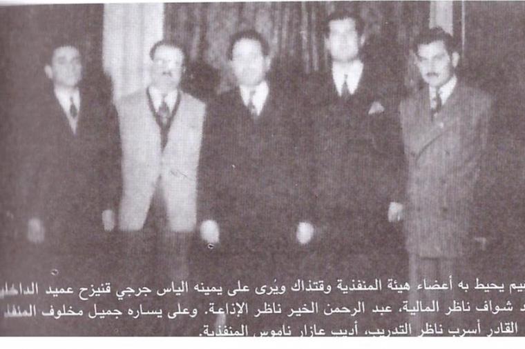الزعيم يحيط به اعضاء هيئة المنفذية (منفذية اللاذقية) وقتذاك ويرى على يمينه الياس جرجي قنيزح عميد الداخلية، يليه فؤاد شواف ناظر المالية، عبد الرحمن الخير ناظر الاذاعة، وعلى يساره جميل مخلوف المنفذ العام، عبد القادر اسرب ناظر التدريب، اديب عازار ناموس المنفذية