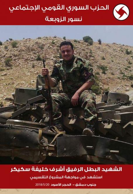 يزّف الحزب إلى الأمة وعموم السوريين القوميين الاجتماعيين في الوطن وعبر الحدود، خبر إستشهاد الرفيق أشرف خليفة سكيكر، وذلك أثناء قيامه بواجبه القومي في مواجهة الارهاب بمنطقة الحجر الأسود. الشهيد البطل من مواليد مواليد الميدان ـ دمشق 14/2/1987، متأهل وله ولدان. التحق في تشكيلات نسور الزوبعة العام 2014، في جرمانا ضمن نطاق منفذية ريف دمشق، وشارك في العديد من المعارك ضد الارهاب، خصوصاً في معارك عين ترما، عرنة، حضر، واستشهد في 20/5/2018 في معارك الحجر الأسود بمواجهة تنظيم "داعش" الارهابي. تميز الشهيد البطل بمناقبيته والتزامه واقدامه، وكان مثالاً للمقاتل الشجاع المندفع في سبيل قضية تساوي وجوده. ارتقى شهيداً بعدما ساهم مع رفقائه في نسور الزوبعة في القتال الى جانب الجيش السوري لتحرير منطقة الحجر الأسود من الارهاب، وبدمائه ودماء وتضحيات النسور وبواسل الجيش والقوى الحليفة والرديفة، باتت منطقة الحجر الأسود قاب قوسين أو أدنى من أن تصبح خالية من الارهاب وتعود الى حضن الوطن محررة. إن الحزب السوري القومي الاجتماعي، يعاهد شهيده البطل وكل شهداء الحزب والجيش والأمة، على مواصلة طريق الصراع والمقاومة دفاعاً عن أرضنا وشعبنا. كما يؤكد الحزب أن أمةً يبنري أبناؤها دفاعاً عن حياضها وعزها وكرامتها، ويستشهدون في سبيلها، هي أمة حق وخير وجمال، جديرة بالبقاء، ولأنها كذلك، نرى هذا الصمود الرائع الذي أفشل مخططات التفتيت والتقسيم وهزم الارهاب ومشغليه الدوليين والاقليميين والعرب. "شهداؤونا هم طليعة انتصاراتنا الكبرى"، وكلما ارتقى منا شهيد، تقترب ساعة الحسم والانتصار، وصبح النصر الحاسم آت لا محال. |