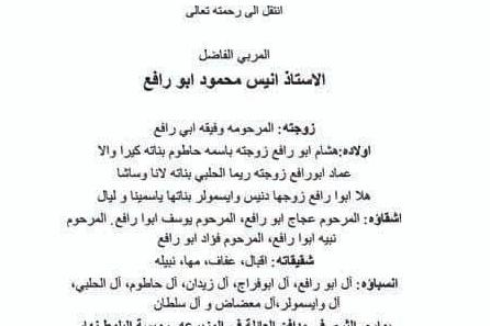 (9) شقيق الرفيق انيس ابو رافع. قضى باكراً عام 1971 وهو في عز شبابه، نشط حزبياً في ستينيات القرن الماضي.