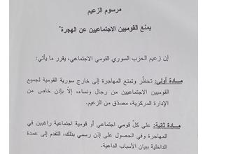 مادة أولى: تحظّر وتمنع المهاجرة الى خارج سورية القومية لجميع القوميين الاجتماعيين من رجال ونساء، إلّا بإذن خاص من الإدارة المركزية، مصدّق من الزعيم.