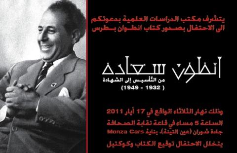 بدعوة من مكتب الدراسات العلمية يقام حفل توقيع كتاب انطوان بطرس "انطون سعاده من التأسيس حتى الشهادة 1932-1949 " وذلك نهار الثلاثاء الواقع في 17 ايار 2011 الساعة 5 مساءً في قاعة نقابة الصحافة جادة شوران (عين التينة). بناية Monza Cars يتخلل الاحتفال توقيع الكتاب وكوكتيل المتكلمون: الأمين محمد بعلبكي،نقيب الصحافة اللبنانية الأمين مسعد حجل،رئيس اسبق للحزب السوري القومي الاجتماعي الأمين منصور عازار، رئيس مكتب الدراسات العلمية انطوان بطرس، المؤلف تقديم الأمين سركيس ابو زيد هذا الكتاب (مجلدان من 1090 صفحة) هو محاولة لوضع مرجع اوّلي متكامل لتطلعات سعاده واهدافه وفكره وجهاده كما مارسها وسط بيئة دوليّة وظرف تاريخي معيّنين لهما حساباتهما وشكلاهما، بالتالي، التحدّي الرئيسي الذي تصارع وإياه فصرعه. وهذا الكتاب هو نواة لتوثيق الصراع من اجل سورية الذي خاضه سعاده ودفع حياته ثمناً له. وما نقوم به هو محاولة اعادة تكوين مسرح الاحداث بأبطاله وأجوائه.