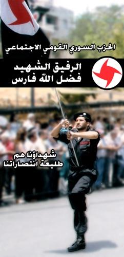 أصدر المكتب السياسي للحزب في الشام (سوريا) بياناً زفً فيه شهيداً جديداً هو الرفيق فضل لله فارس. وجاء في البيان: يزفّ المكتب السياسي للحزب في الشام (سوريا) الرفيق فضل الله حسين فارس الذي استشهد في معركة الدفاع عن مدينة صدد في ريف حمص. ويؤكد المكتب السياسي أنّ التضحية وبذل الدماء دفاعاً عن أهلنا ومناطقنا في مواجهة العصابات الإرهابية المتطرفة ورعاتهم وداعميهم، واجب قومي ومفخرة للأمة، وهذه هي وقفات العز المشرّفة التي يقفها القوميون الاجتماعيون ودأبهم الشهادة من أجل العز والانتصار. إنّ دماء القوميين التي امتزجت بدماء شهداء الجيش السوري وروت أرض مدينة صدد ـ حمص وكلّ تراب سورية، تثمر نصراً مؤزّراً على الإرهاب والتطرّف، من علائمه دحر الإرهابيين عن مدينة صدد بعد أن عاث الإرهاب فيها إجراماً وقتلاً للناس، وتدميراً للممتلكات العامة والخاصة والكنائس والأديرة والأماكن الأثرية التي تعود إلى آلاف السنين. وإذ يجدّد الحزب السوري القومي الاجتماعي موقفه بتحميل الدول الغربية والعربية الداعمة للمجموعات الإرهابية المتطرّفة المسؤولية الكاملة عن إراقة دماء السوريين، فإنه يؤكد أنّ دماء الشهداء القوميين الأبطال والعسكريين البواسل والمدنيين الأبرياء، ستقضّ مضاجع كلّ الذين تآمروا على سوريا وغذّوا الإرهاب والتطرّف بالمال والسلاح وأدوات الإجرام. هذا وسيشيّع الشهيد الرفيق فضل الله فارس في مأتم شعبي وحزبي مهيب من أمام مشفى الزعيم إلى قريته بلوزة في حمص. والشهيد من مواليد بلوزة ـ حمص 20-01-1985 ، انتمى إلى الحزب في العام 2010، متاهل وله ابنة وحيدة اسمها سوريانا. وقد تميّز الشهيد بإقدامه وشجاعته وكان كادراً حزبياً أوكلت اليه العديد من المهام وحصل على عدة تنويهات من مسؤوليه. وكان المكتب السياسي في الشام، قد زفّ قبل عدة أيام الشهيد الرفيق بشار شاهين الذي استشهد في معركة الدفاع عن مدينة صدد.