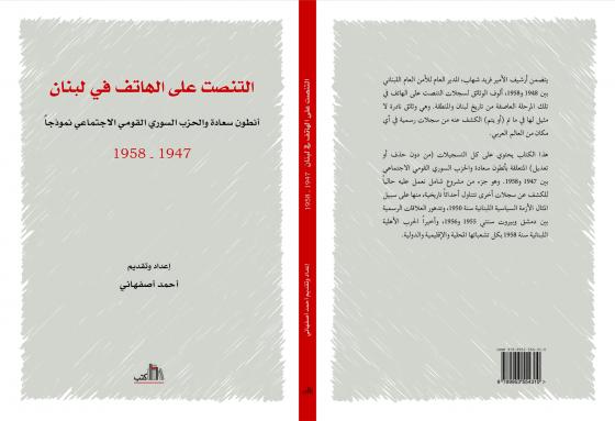 صدر في بيروت أخيراً عن "دار كتب للنشر" كتاب "التنصت على الهاتف في لبنان: أنطون سعادة والحزب السوري القومي الاجتماعي نموذجاً (1947 ـ 1958)" من إعداد وتقديم أحمد أصفهاني. والكتاب سيكون حلقة من سلسلة تعتمد على سجلات التنصت على الهاتف التي نظمتها المديرية العامة للأمن العام اللبناني بين 1946 و1958، وتشكل جزءاً من أرشيف الأمير فريد شهاب المدير العام للأمن العام بين 1948 و1958.