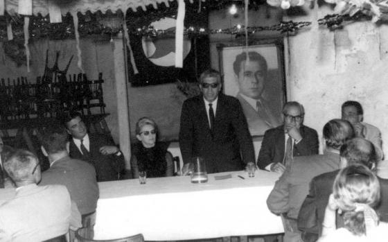 الرفيق مصطفى يحيى يلقي كلمة في احد الاحتفالات الحزبية والى يمينه الامينة الاولى،